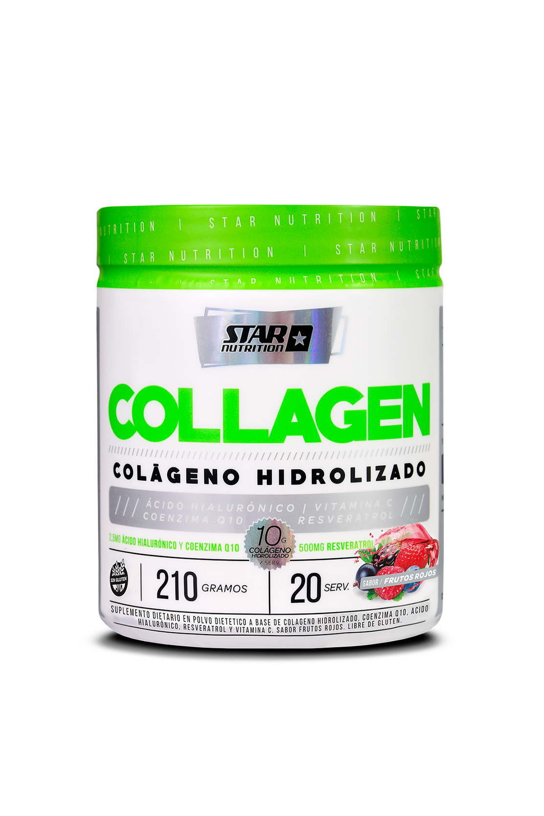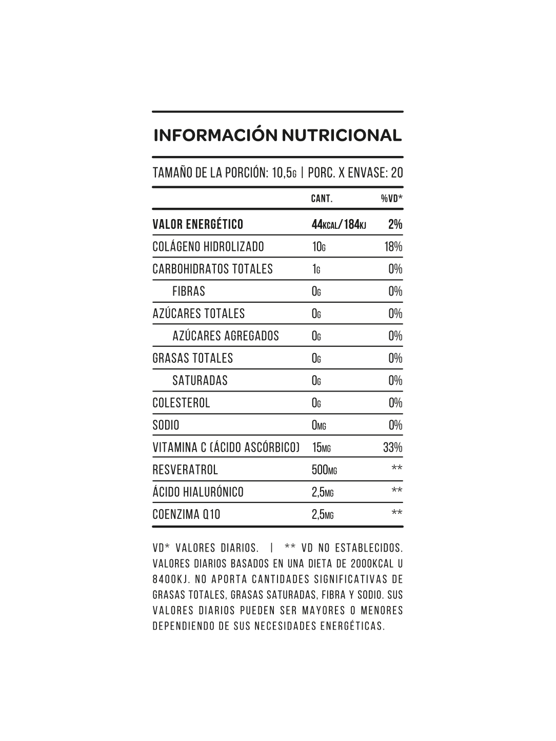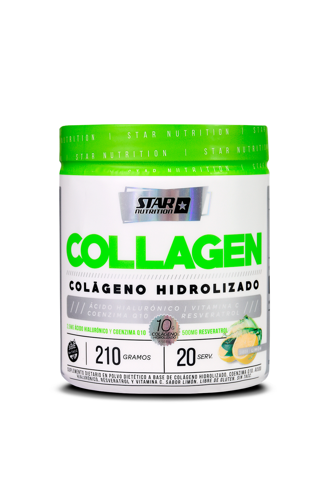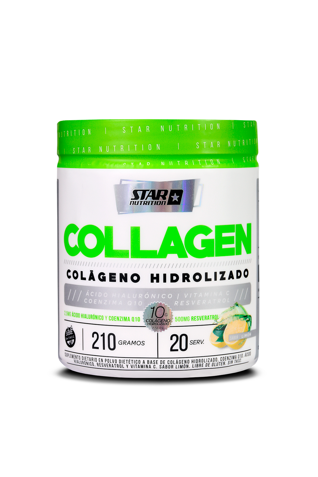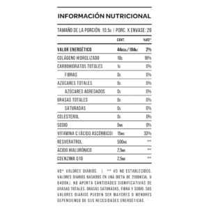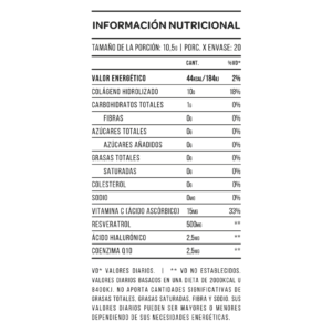 Suplemento en polvo a base de colágeno hidrolizado con vitamina C, ácido hialurónico, coenzima Q10 y resveratrol. Sabor limón. Libre de gluten (Sin TACC). Presentación: 210 g (≈20 porciones).