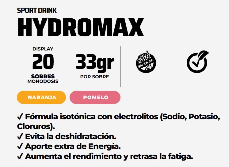 Hydromax es una bebida isotónica desarrollada para favorecer una rehidratación rápida, reponer sales minerales y aportar energía durante o después de actividades físicas intensas. Su fórmula combina carbohidratos de absorción rápida, electrolitos esenciales (sodio, cloro, potasio) y vitaminas antioxidantes C y E que ayudan a combatir el estrés oxidativo y mantener el rendimiento físico.