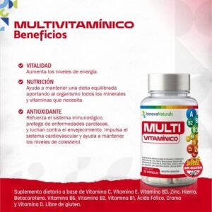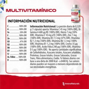 Multivitamínico x 30 cápsulas – Innovanaturals es un suplemento dietario formulado para aportar una combinación balanceada de vitaminas y minerales esenciales que tu organismo necesita para funcionar de manera óptima. Su fórmula incluye micronutrientes clave como vitaminas A, C, D, E y del complejo B, junto con zinc, hierro, ácido fólico y cromo, pensados para apoyar múltiples funciones del cuerpo.