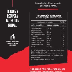 100 % maní tostado seleccionado, sin aditivos ni conservantes. Disponible versión Natural o con trozos (Crunch).