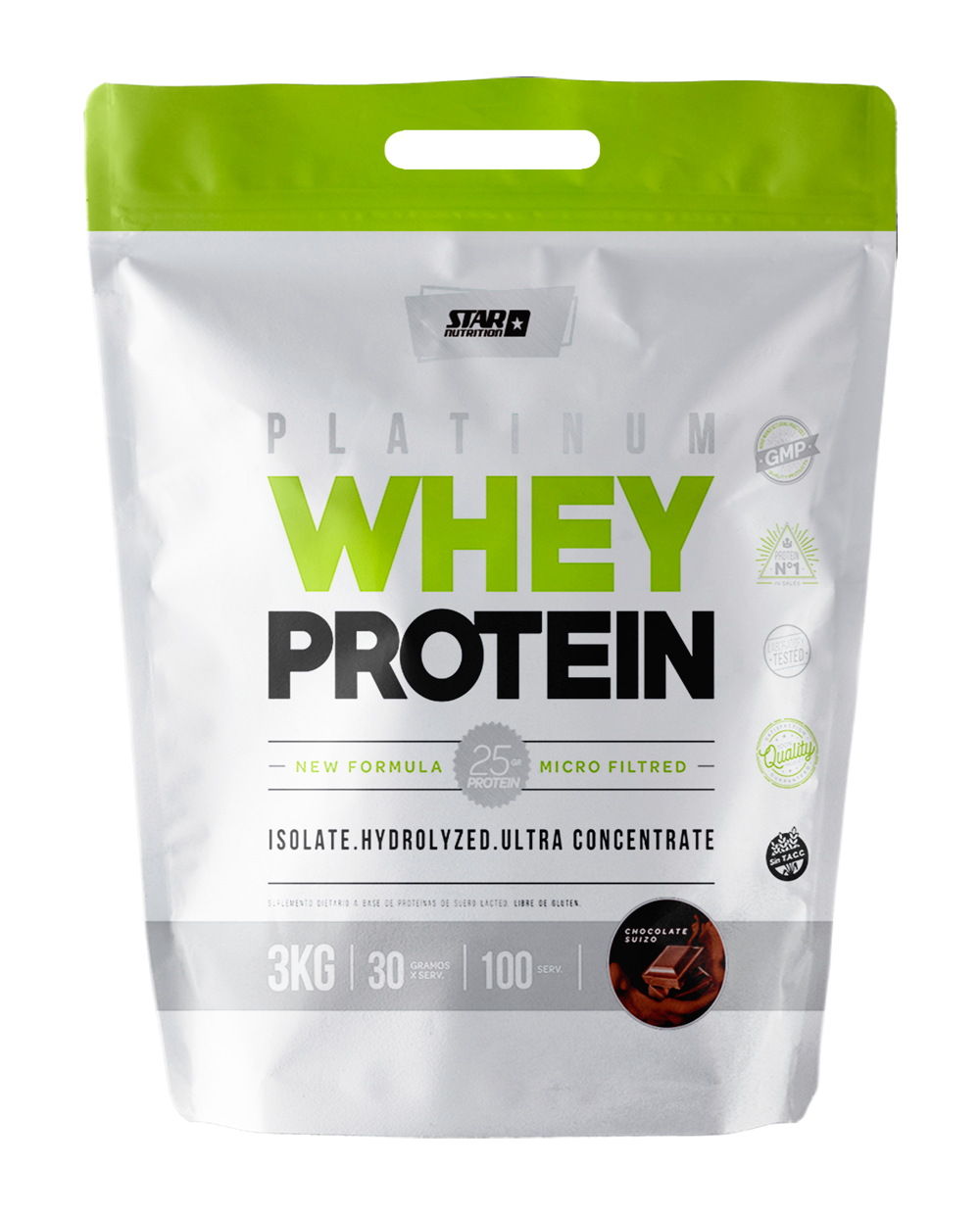 Proteína de suero premium (concentrado, aislado e hidrolizado), con 25 g de proteína por porción, bajo contenido de grasa y carbohidratos, en envase de 3 kg. Ideal para masa muscular y recuperación.